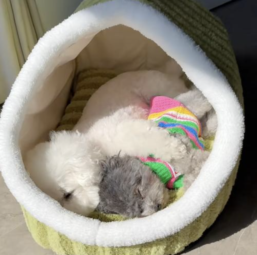 Now my 2 cuties sleep together... they never did! Maybe that's because the bed is indeed similar to a nest and they feel warm and secure. Strange because they have other beds. I am glad my bigger dogs didn't rip it apart yet lol