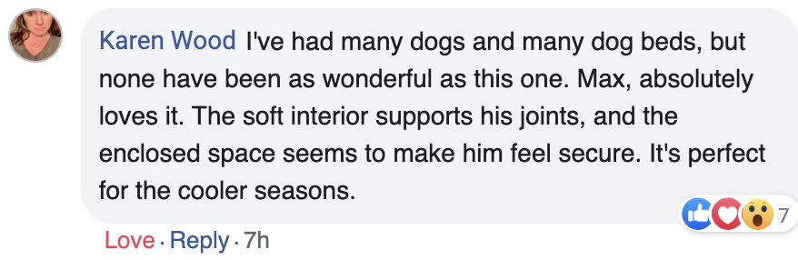 I just love this bed and my pup loves too!!! He lays in it all day and I noticed that during storm he buries in the pillow and he looks secure and comfy. By the way, Julie from customer support was very helpful, I initially lost my tracking number.
